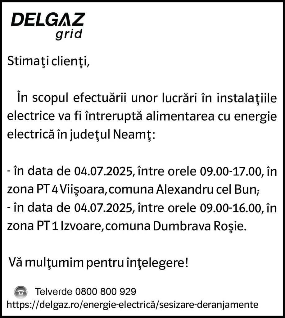 Intreruperi Neamt – 01.07.2025