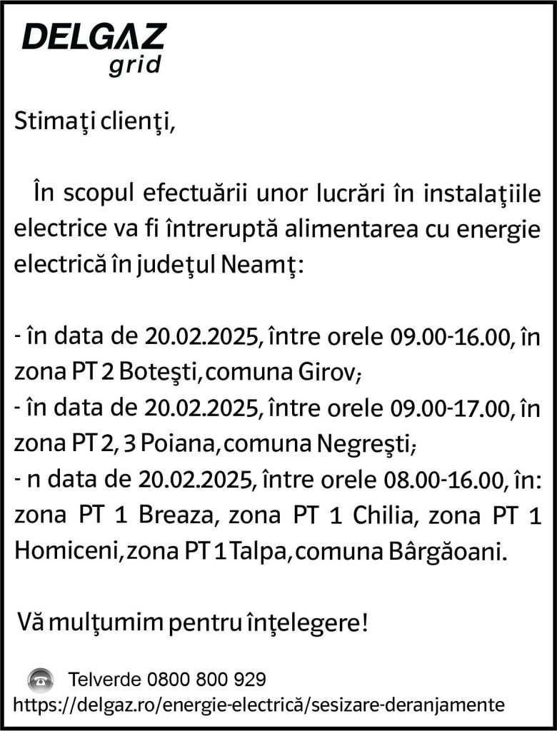 Intreruperi Neamt 1 – 17.02.2025