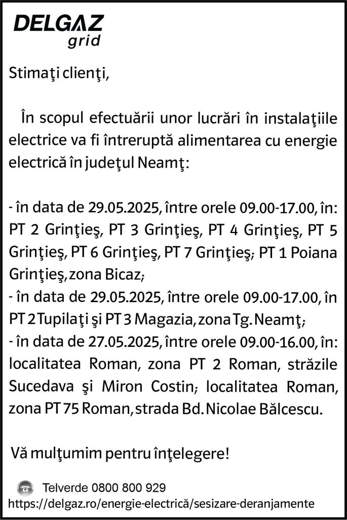 Intreruperi Neamt 1 – 26.05.2025